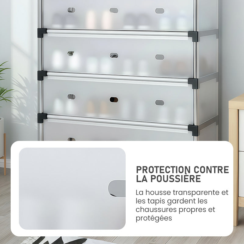 PROTECTION CONTRE LA POUSSIÈRE ET L’HUMIDITÉ – Personne n’aime les chaussures poussiéreuses. Une housse transparente empêche la poussière de s’accumuler, tandis que les tapis inclus ajoutent une protection supplémentaire. Le niveau inférieur est surélevé par rapport au sol, ce qui facilite le nettoyage en dessous et garde vos chaussures – ainsi que votre sol – plus frais plus longtemps.